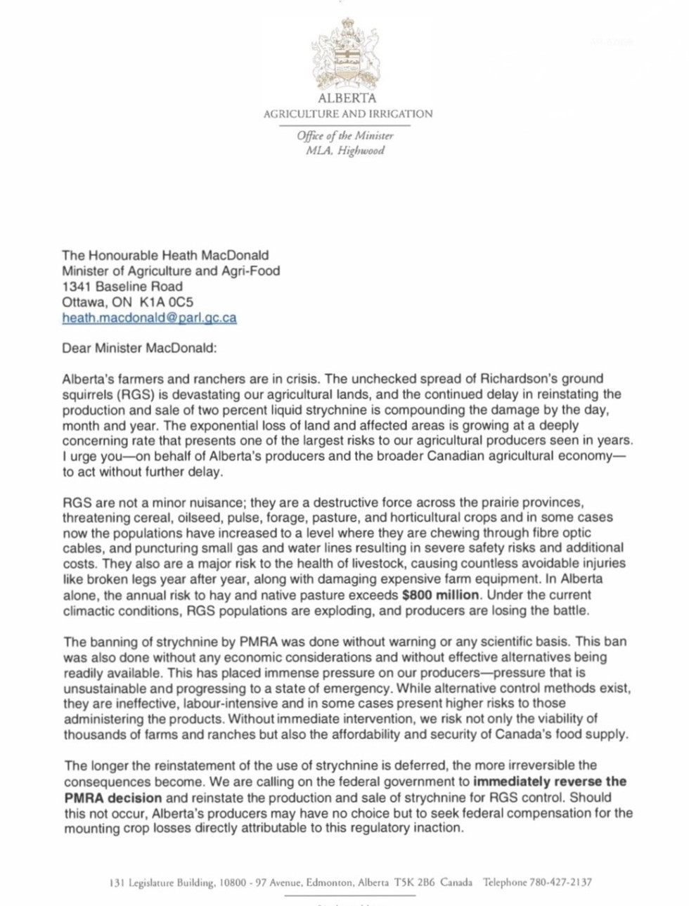 Minister of Agriculture and Irrigation RJ Sigurdson issued a statement on the federal rejection of strychnine for emergency pest management.